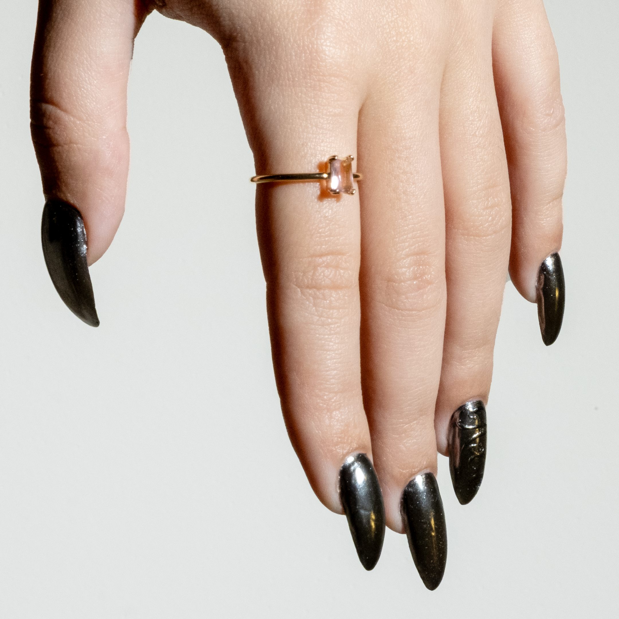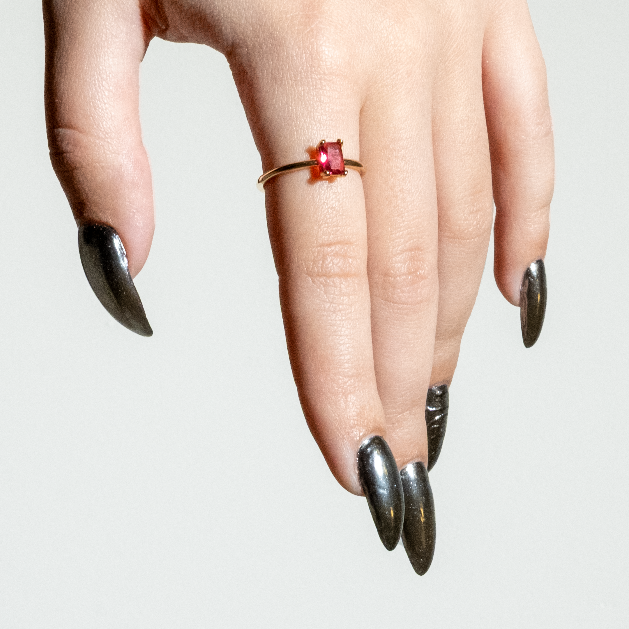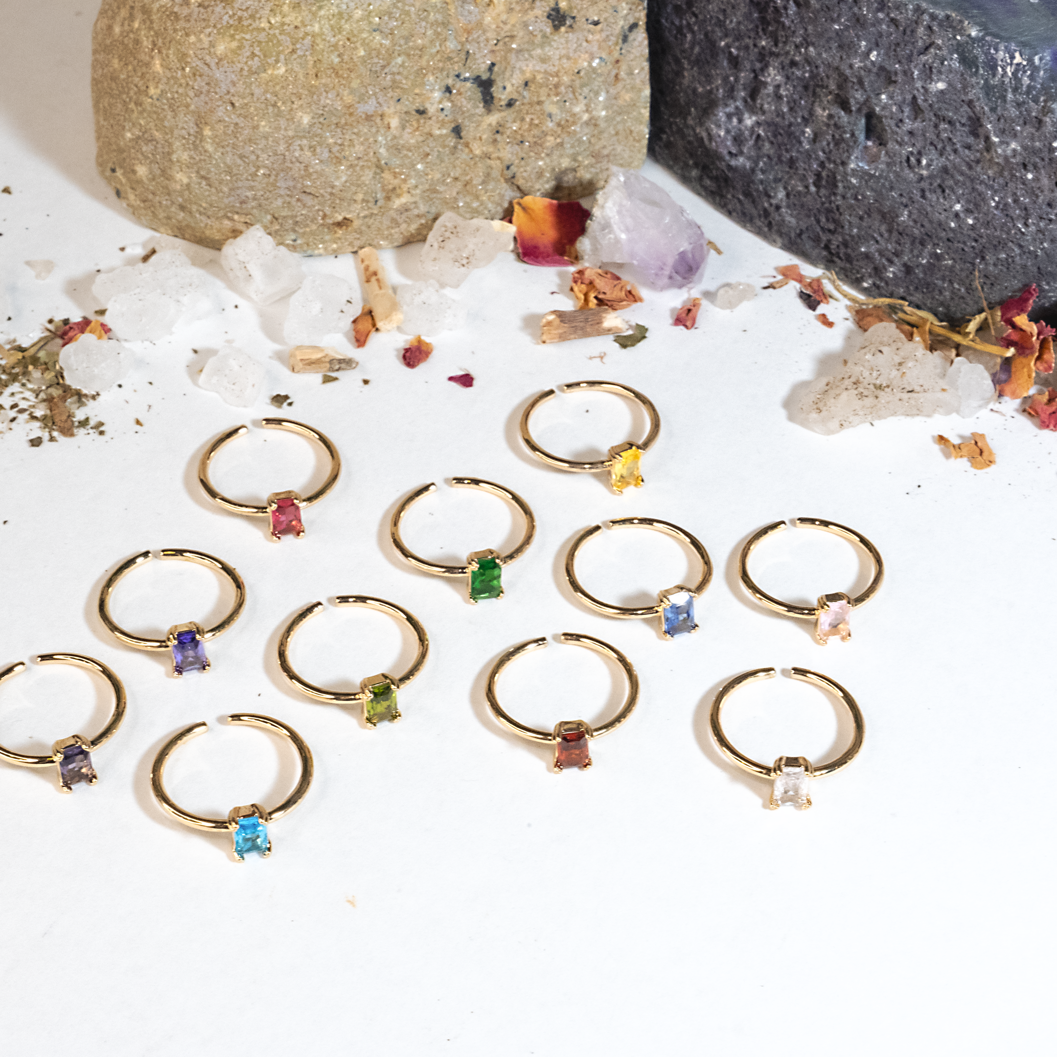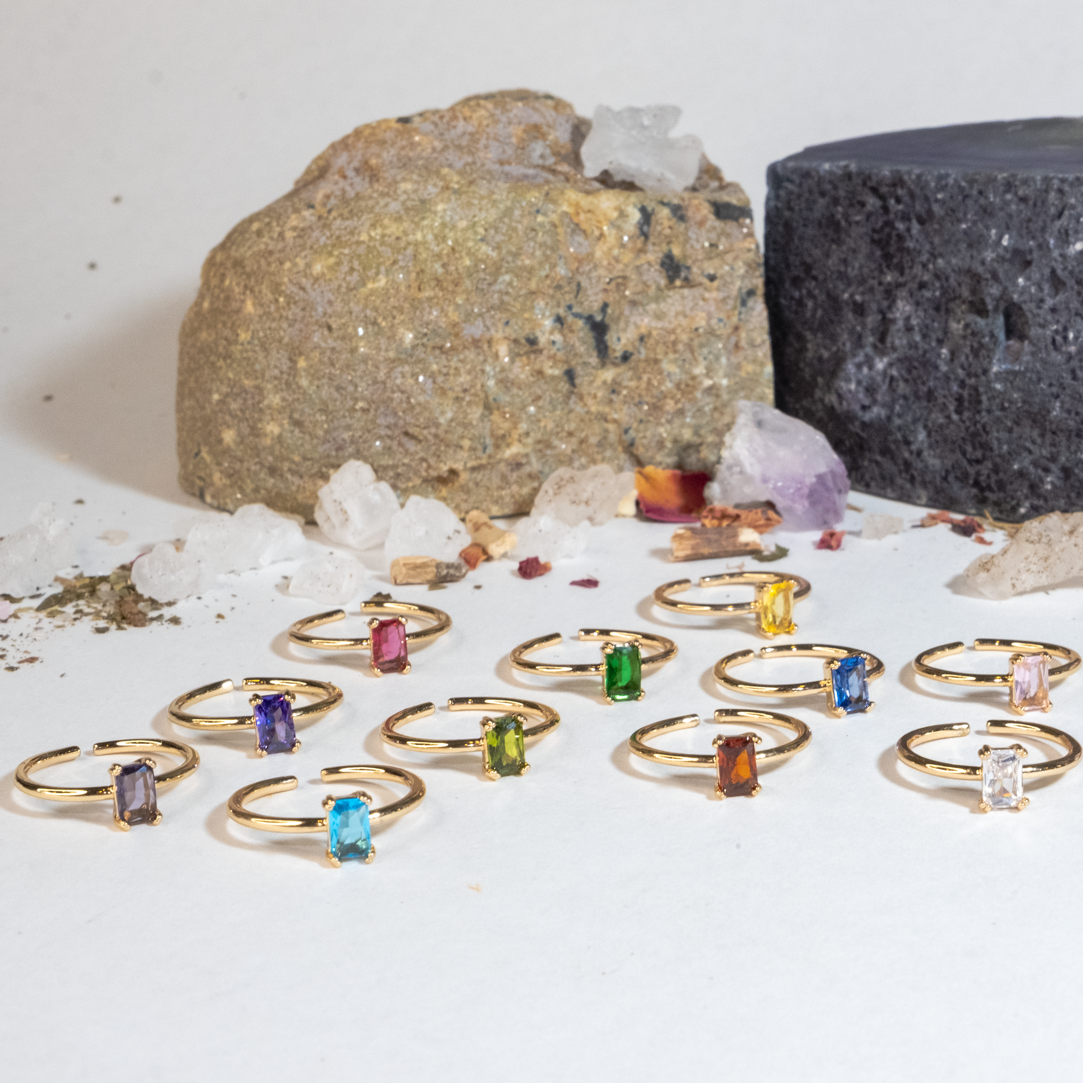 Discover the perfect union between delicacy and meaning. This 18k gold-plated ring features a rectangular-cut stone at its center, representing the unique energy of your birth. The stone's intense color reflects personality, protection, and timeless beauty, making every detail an amulet of style and spirituality.