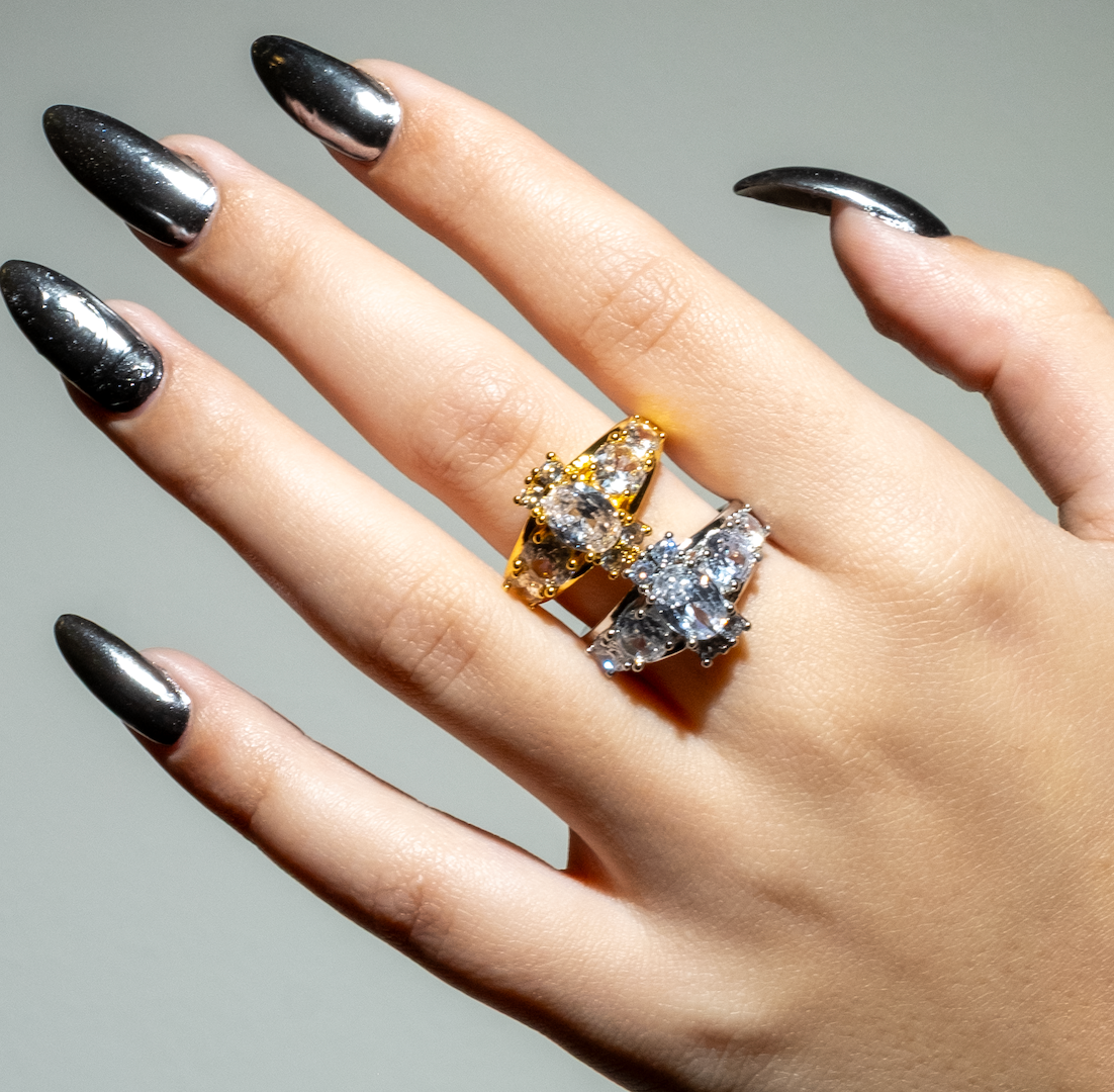 Um anel deslumbrante, disponível em dourado ou prateado, com pedras brilhantes e cravejadas que iluminam qualquer look. Elegância e sofisticação para momentos especiais ou para transformar o dia a dia em puro glamour. O Anel é Ajustável, não necessitando escolher o Aro (tamanho).