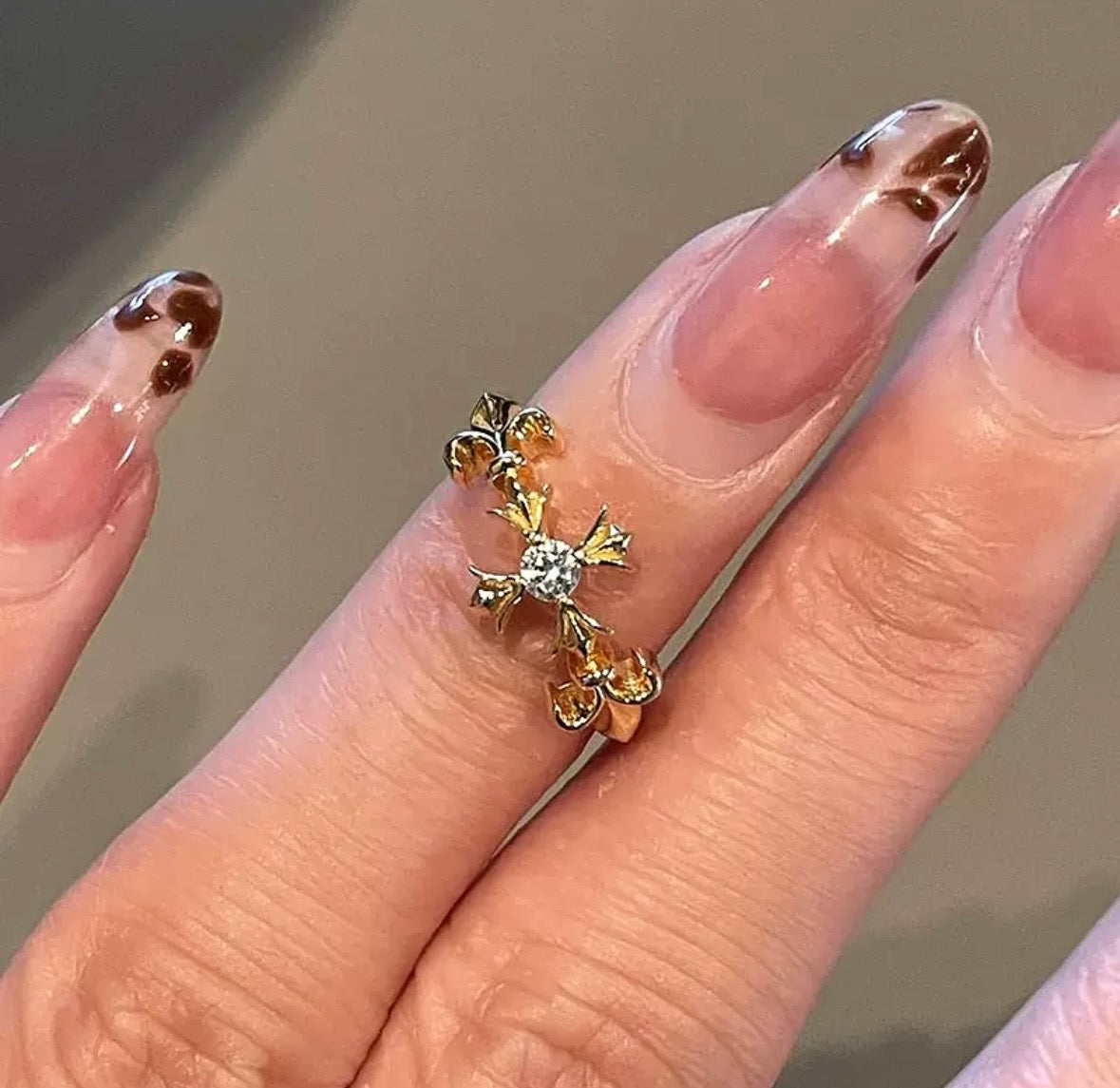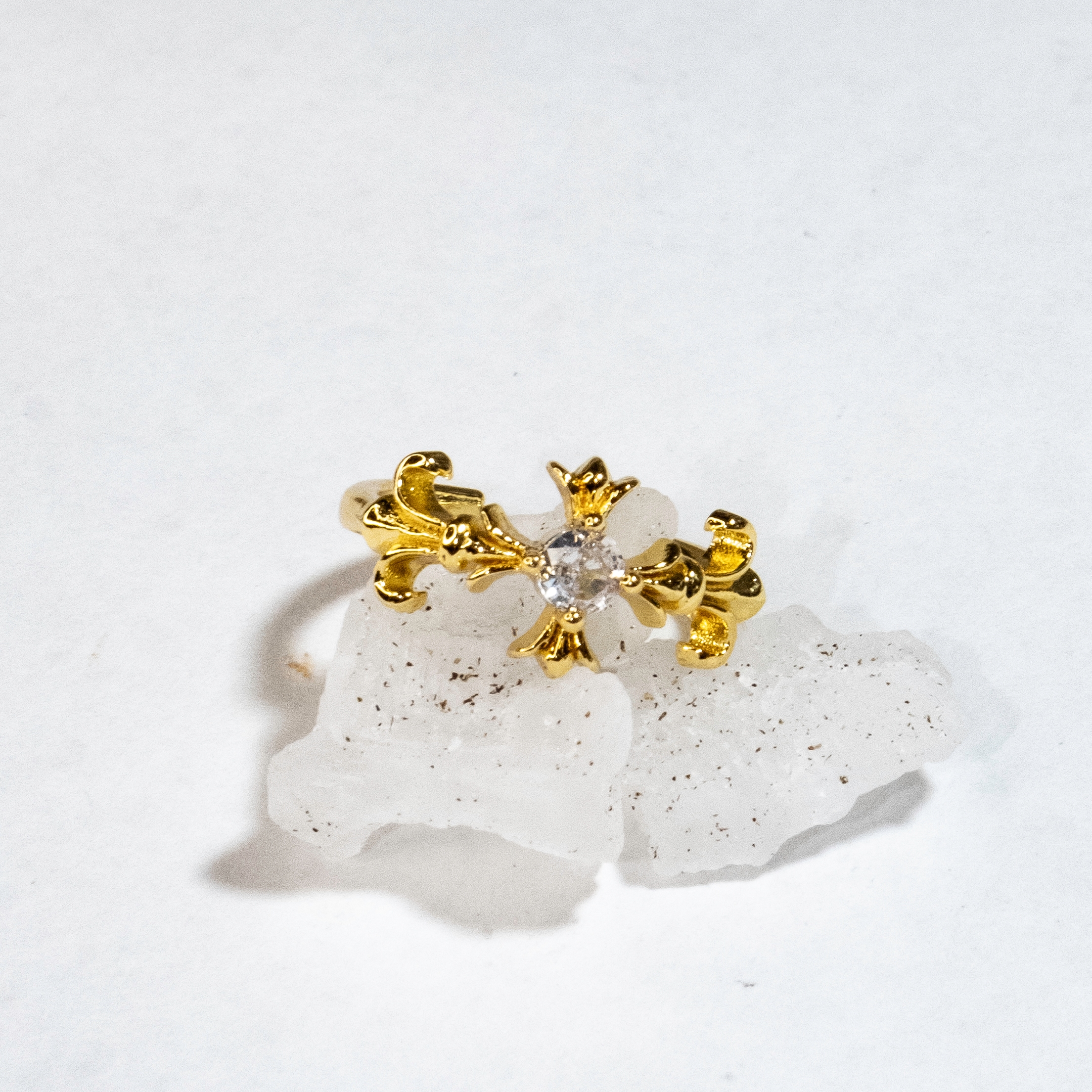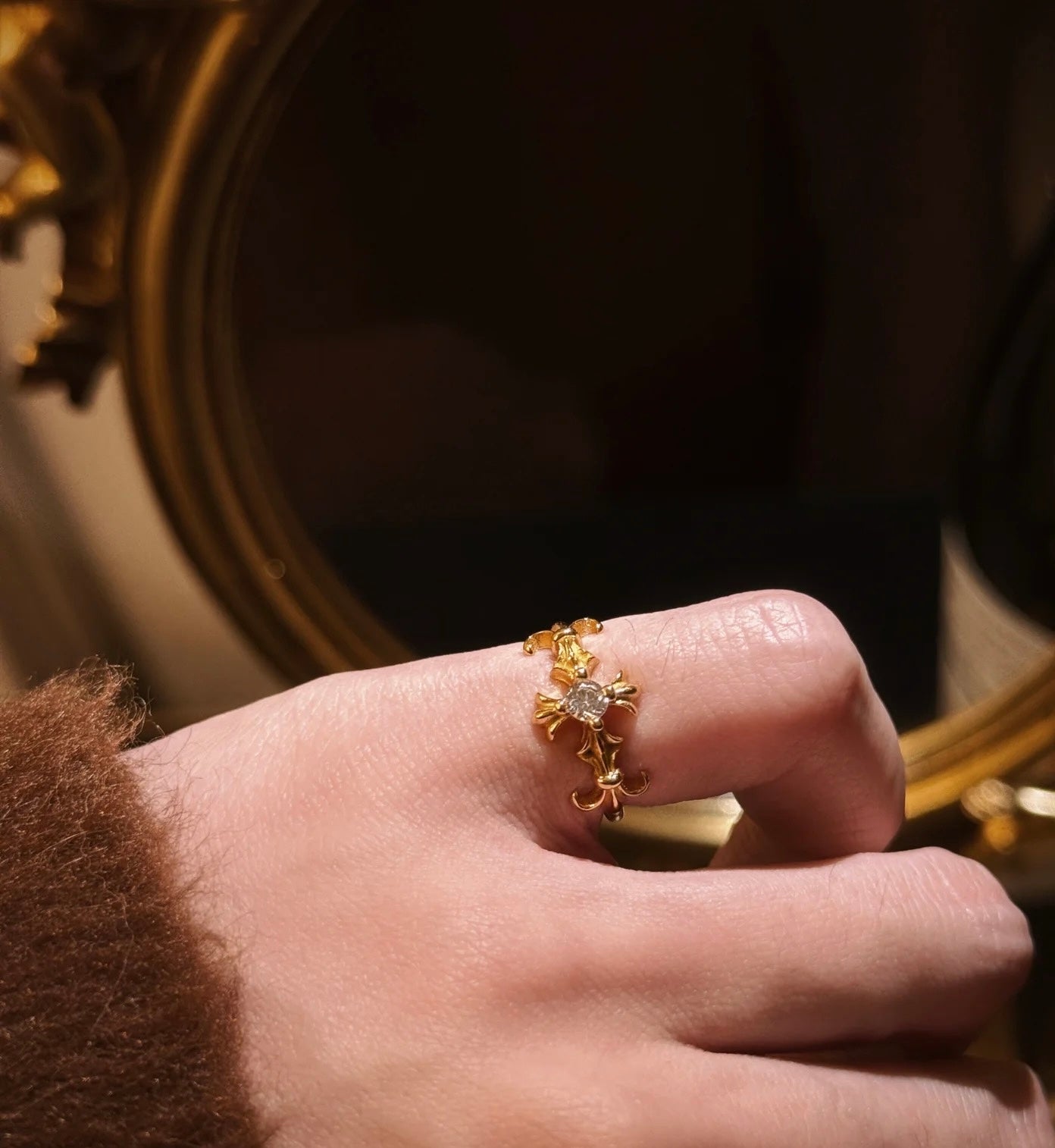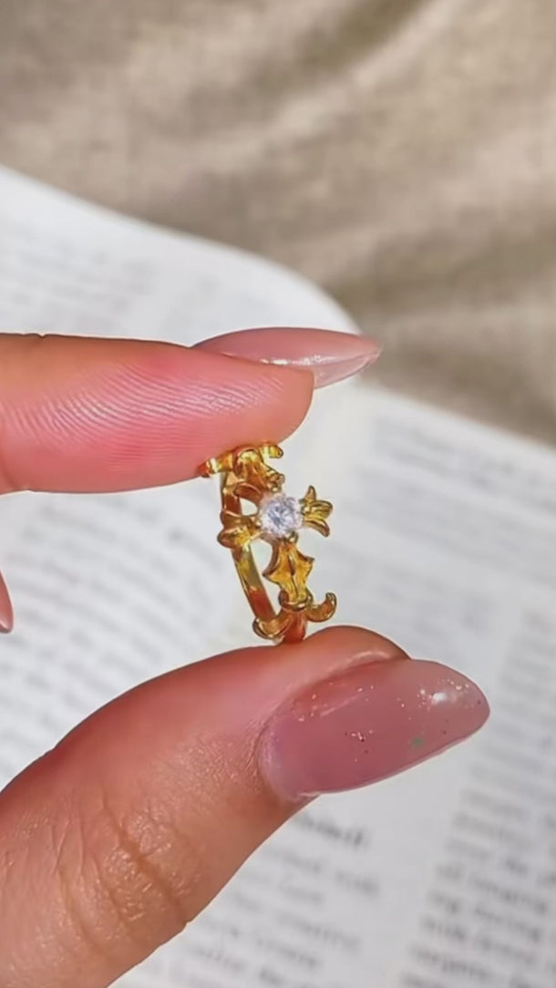 Um anel dourado de aura mística, com design em forma de cruz ornamentada e um cristal central que reflete a luz com intensidade celestial.